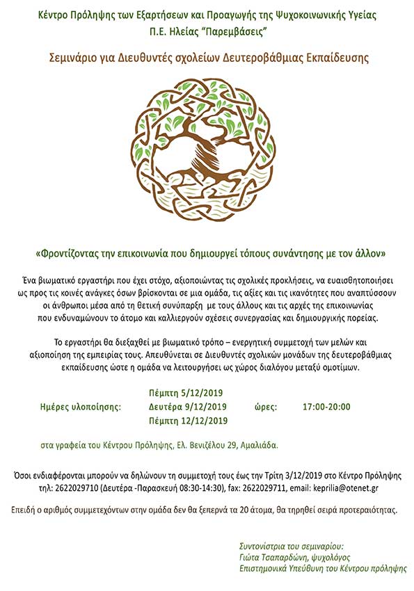 Το σεμινάριο, διάρκειας 3 συναντήσεων, στηρίζεται στην ενεργητική συμμετοχή και στην αξιοποίηση της εμπειρίας των συμμετεχόντων. Συντονίστρια του σεμιναρίου είναι η Γιώτα Τσαπαρδώνη, ψυχολόγος. Όσοι ενδιαφέρονται χρειάζεται να εκδηλώσουν το ενδιαφέρον τους έως την Τρίτη 3/12/2019, στο Κέντρο Πρόληψης