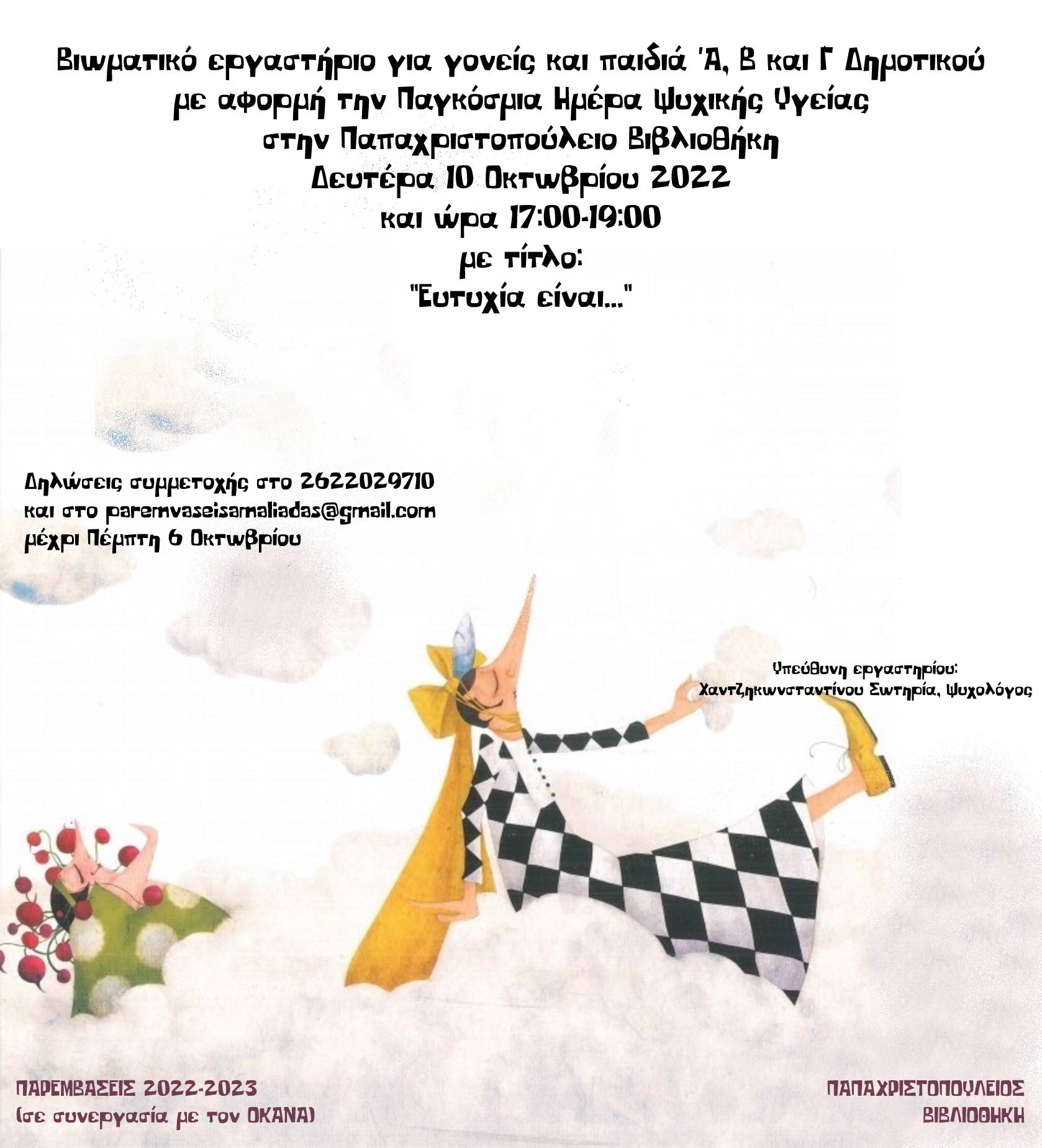 Το πρώτο εργαστήριο με τίτλο «Ευτυχία είναι»  θα πραγματοποιηθεί με αφορμή την Παγκόσμια Ημέρα Ψυχικής Υγείας, Δευτέρα 10 Οκτωβρίου 2022 και ώρα 17:00 με 19:00. Δηλώστε συμμετοχή για εσάς και το παιδί σας μέχρι Πέμπτη 6 Οκτωβρίου 2022 (από Δευτέρα έως Παρασκευή 09:00 έως 14:00) στο 2622029710 ή στο Αυτή η διεύθυνση Email προστατεύεται από τους αυτοματισμούς αποστολέων ανεπιθύμητων μηνυμάτων. Χρειάζεται να ενεργοποιήσετε τη JavaScript για να μπορέσετε να τη δείτε. ή στην παρακάτω φόρμα: