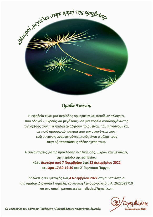 Ξεκίνησαν οι δηλώσεις συμμετοχής για τους γονείς εφήβων και θα διαρκέσουν μέχρι 4 Νοεμβρίου 2022. Η ομάδα θα πραγματοποιηθεί δια ζώσης και απευθύνεται στους γονείς του Δήμου Πύργου.