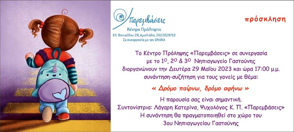 Το Κέντρο Πρόληψης «Παρεμβάσεις» ανταποκρινόμενο σε κοινό αίτημα του 1ου , 3ου & 4ου Νηπιαγωγείου Γαστούνης θα πραγματοποιήσει, την Δευτέρα 29 Μαΐου και ώρα 17:00, στο 3ο Νηπιαγωγείο Γαστούνης ομιλία – συζήτηση για τους γονείς των μαθητών με θέμα την ομαλή μετάβαση των παιδιών από το Νηπιαγωγείο στο Δημοτικό. Η παρουσία των γονιών είναι σημαντική.