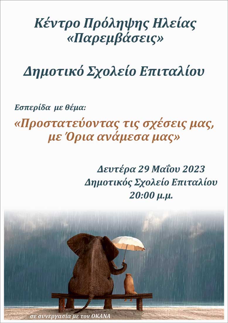 Ανταποκρινόμενος ο φορέας μας, σε αίτημα του Δημοτικού Σχολείου Επιταλίου, θα πραγματοποιήσει ομιλία- συζήτηση, αναφορικά με τη φροντίδα που παρέχουν τα όρια , τόσο στη γονεική , όσο και στην εκπαιδευτική σχέση, υποστηρίζοντας την ομαλή ψυχοκοινωνική ανάπτυξη των παιδιών.
