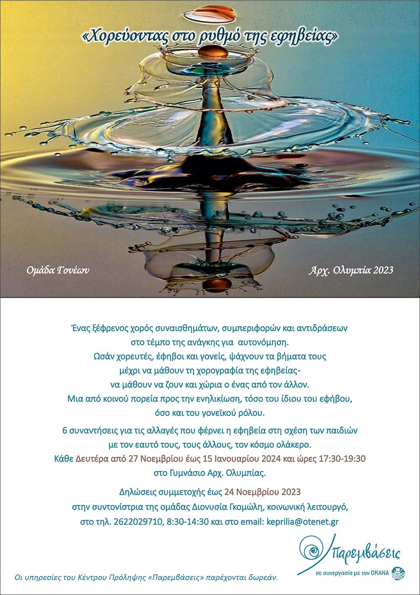 …Σας προσκαλούμε στην Ομάδα γονέων που θα πραγματοποιείται κάθε Δευτέρα για 6 συναντήσεις, στο Γυμνάσιο Αρχ. Ολυμπίας από 27/11/2023….για να στηρίξουμε το γονεικό ρόλο στο μεγάλωμα του!!!