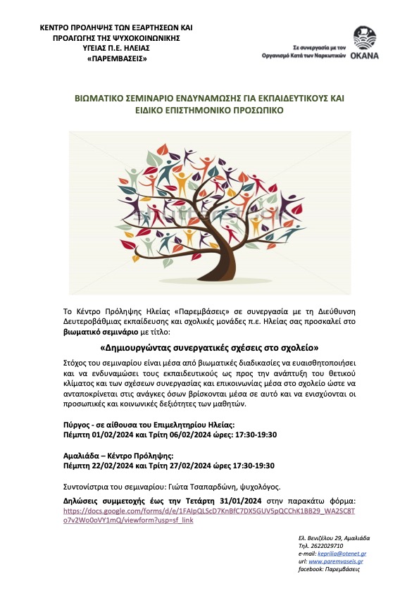 Το Κέντρο Πρόληψης Ηλείας «Παρεμβάσεις» σε συνεργασία με τη Διεύθυνση Δευτεροβάθμιας εκπαίδευσης και σχολικές μονάδες π.ε. Ηλείας σας προσκαλεί στο βιωματικό σεμινάριο με τίτλο: