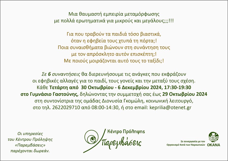 Μια θαυμαστή εμπειρία μεταμόρφωσης με πολλά ερωτηματικά για μικρούς και μεγάλους... ζητούνται νέες απαντήσεις για τις νέες ανάγκες που εκφράζουν οι αλλαγές στην εφηβεία σε 6 συναντήσεις.