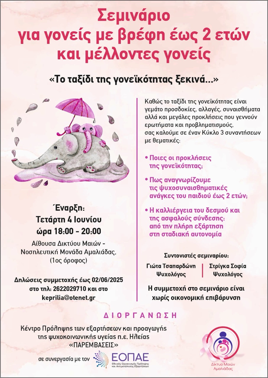 Το Κέντρο Πρόληψης Ηλείας «Παρεμβάσεις» φορέας που λειτουργεί σε συνεργασία με τον Εθνικό Οργανισμό Πρόληψης και Αντιμετώπισης των Εξαρτήσεων Ε.Ο.Π.Α.Ε.  και το Δίκτυο Μαιών Αμαλιάδας θα υλοποιήσει σεμινάριο σε γονείς  βρεφικής ηλικίας και μέλλοντες γονείς με θέμα: «Το ταξίδι της γονεϊκότητας ξεκινά…». Στόχος είναι να ευαισθητοποιήσει και να υποστηρίξει τους γονείς στην αρχή αυτού του νέου ταξιδιού που είναι γεμάτο προσδοκίες, αλλαγές, συναισθήματα αλλά και προκλήσεις. Οι θεματικές που θα αναπτυχθούν αφορούν στις προκλήσεις της γονεϊκότητας, πως αναγνωρίζουμε τις ψυχοσυναισθηματικές ανάγκες του παιδιού έως 2 ετών, η καλλιέργεια του δεσμού και της ασφαλούς  ως βασική προϋπόθεση για την ανάπτυξη της ασφάλειας και της εμπιστοσύνης στο παιδί.