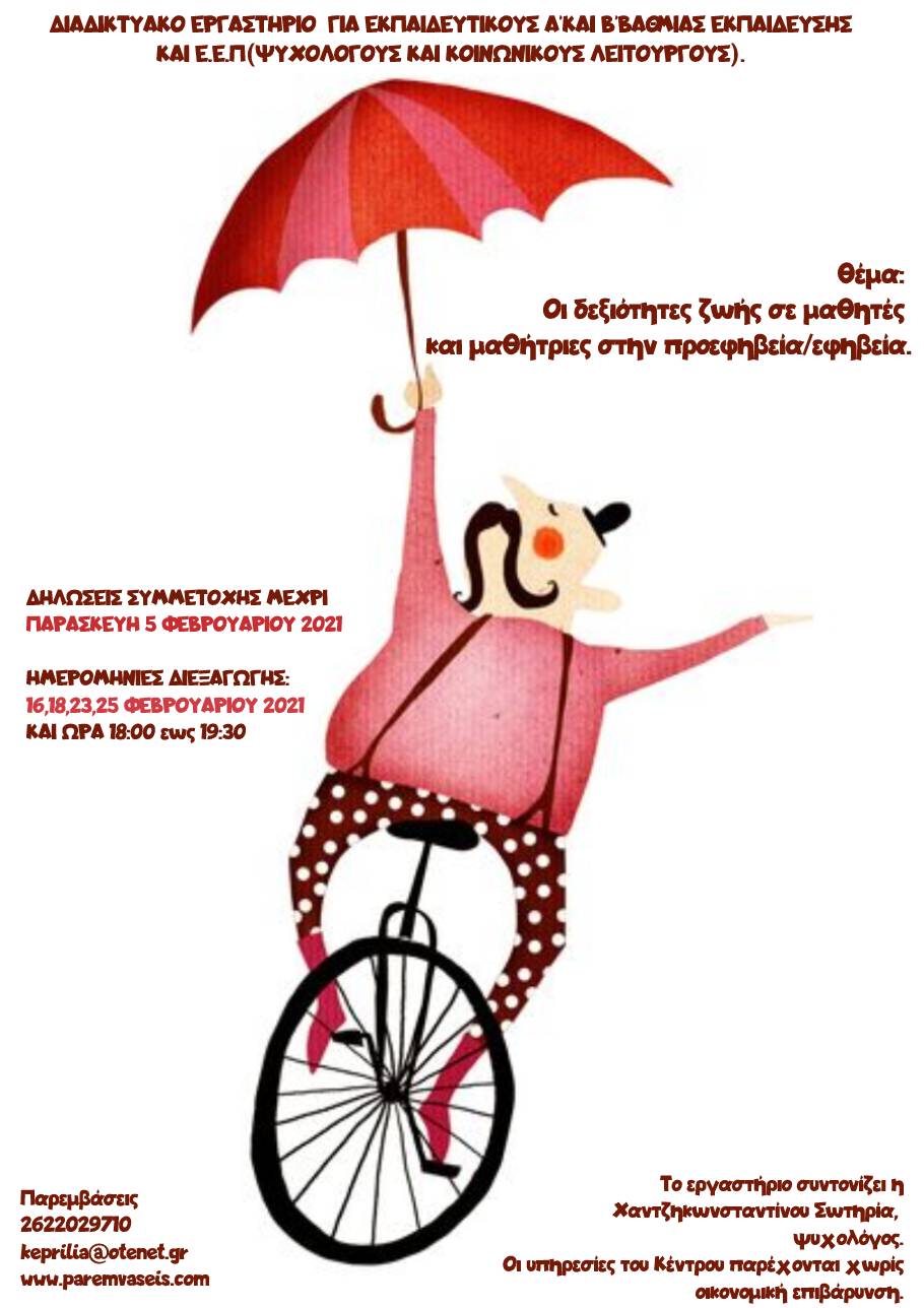 Το Κέντρο Πρόληψης Παρεμβάσεις σε συνεργασία με τις Διευθύνσεις της Πρωτοβάθμιας και Δευτεροβάθμιας εκπαίδευσης, πρόκειται να υλοποιήσει βιωματικό διαδικτυακό εργαστήριο για εκπαιδευτικούς και ειδικό επιστημονικό προσωπικό, ψυχολόγους και κοινωνικούς λειτουργούς που υπηρετούν σε σχολεία της Πρωτοβάθμιας(Ε΄ και ΣΤ΄ Δημοτικού) και της Δευτεροβάθμιας Εκπαίδευσης της Περιφερειακής Ενότητας Ηλείας.