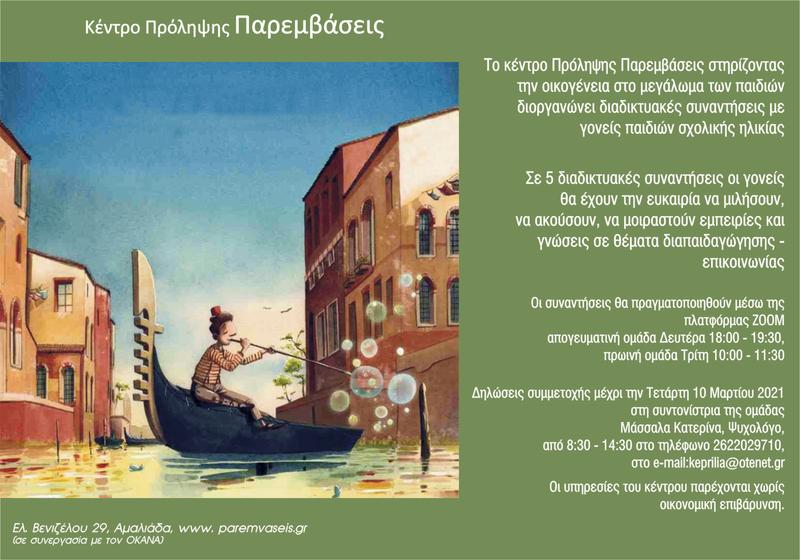 Το Κέντρο Πρόληψης «Παρεμβάσεις» συνεχίζοντας την υλοποίηση δράσεων σε γονείς, υλοποιεί διαδικτυακό πρόγραμμα για γονείς παιδιών σχολικής ηλικίας (6-12 ετών) που φοιτούν στα δημοτικά σχολεία Βάρδας, Μανωλάδας, Νέας Μανωλάδας, Ανδραβίδας, Ανδρίτσαινας, Βασιλακίου, Λάλα, Επιταλίου, Αλφειούσας, Κούμανη, Λαμπείας και Κρεστένων.