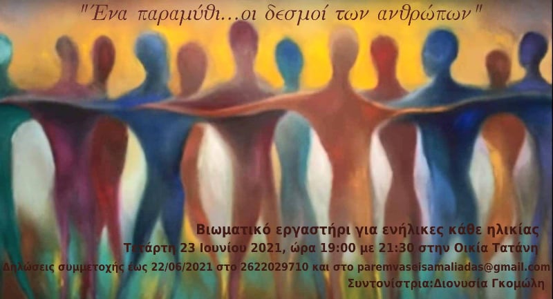 -Βιωματικό εργαστήρι με τίτλο: «Ένα παραμύθι…..οι δεσμοί των ανθρώπων», με στόχο την ευαισθητοποίηση στη δύναμη των ανθρώπινων σχέσεων στην προσωπική εξέλιξη και ανάπτυξη, σε όποια φάση βρίσκεται κανείς. Απευθύνεται σε όσους συναντήσαμε διαδικτυακά αυτή τη χρονιά αλλά και σε όσους επιθυμούν από την ευρύτερη κοινότητα να γνωρίσουν τις υπηρεσίες του Κέντρου μας. Συντονίστρια εργαστηρίου: Γκομώλη Διονυσία, Κοινωνική Λειτουργός σε συνεργασία με την εθελόντρια αφηγήτρια παραμυθιών κ.Νίκη Βασιλοπούλου