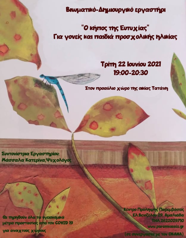 -Βιωματικό- Δημιουργικό εργαστήρι με τίτλο: «Ο κήπος της Ευτυχίας», για γονείς και παιδιά προσχολικής ηλικίας (4-6 ετών), με στόχο την ενδυνάμωση της σχέσης γονιού- παιδιού μέσα από την έκφραση συναισθημάτων. Το εργαστήριο απευθύνεται σε γονείς που συμμετείχαν στις διαδικτυακές δράσεις , που υλοποίησε το Κέντρο κατά τη διάρκεια της χρονιάς. Συντονίστρια εργαστηρίου: Μάσσαλα Κατερίνα, Ψυχολόγος