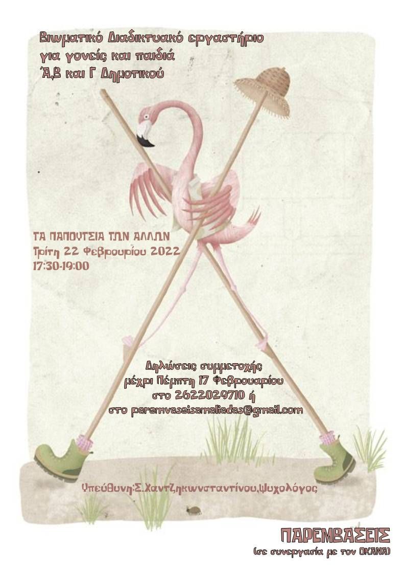 Καινούρια χρονιά με καινούριο διαδικτυακό εργαστήρι για γονείς και παιδιά που φοιτούν στην ΄Α, ‘Β και ‘Γ τάξη με τίτλο "Τα παπούτσια των άλλων". Το εργαστήρι έχει σαν στόχο με τη βοήθεια του παραμυθιού, να δώσει στους γονείς και στα παιδιά τη δυνατότητα να μιλήσουν για τη σχέση τους και τα χαρακτηριστικά της, για τις προσδοκίες που έχουν από αυτή αλλά και να ανακαλύψουν νέους διασκεδαστικούς τρόπους επικοινωνίας.