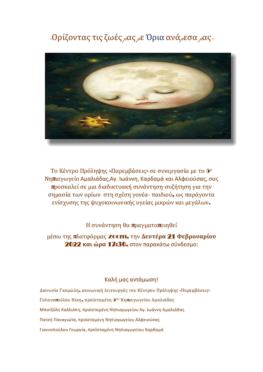 Διαδικτυακή ευαισθητοποίηση- ομιλία σε γονείς και εκπαιδευτικούς του 5ου Νηπιαγωγείου Αμαλιάδας, Αγ. Ιωάννη, Καρδαμά και Αλφειούσας με στόχο την ενίσχυση της συνεργασίας σχολείο και οικογένειας στην ψυχοκοινωνική εξέλιξη των παιδιών.