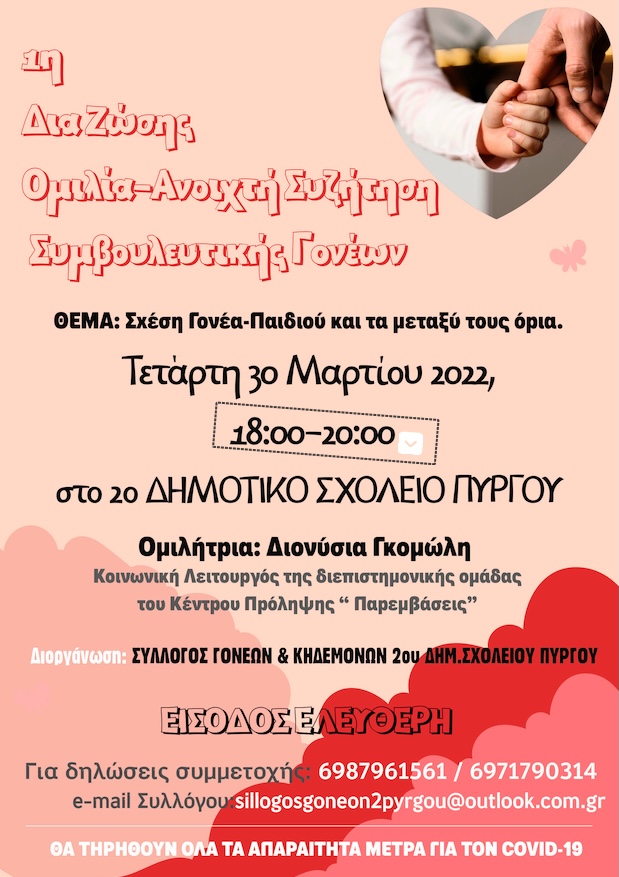Ύστερα από αίτημα του Συλλόγου Γονέων και Κηδεμόνων του 2ου Δημοτικού Πύργου και σε αγαστή συνεργασία μαζί του, σας παρουσιάζουμε πληροφορίες αναφορικά με τη δράση που θα υλοποιήσουμε στις 30 Μαρτίου 2022 και ώρα 18:00 στο σχολείου τους.