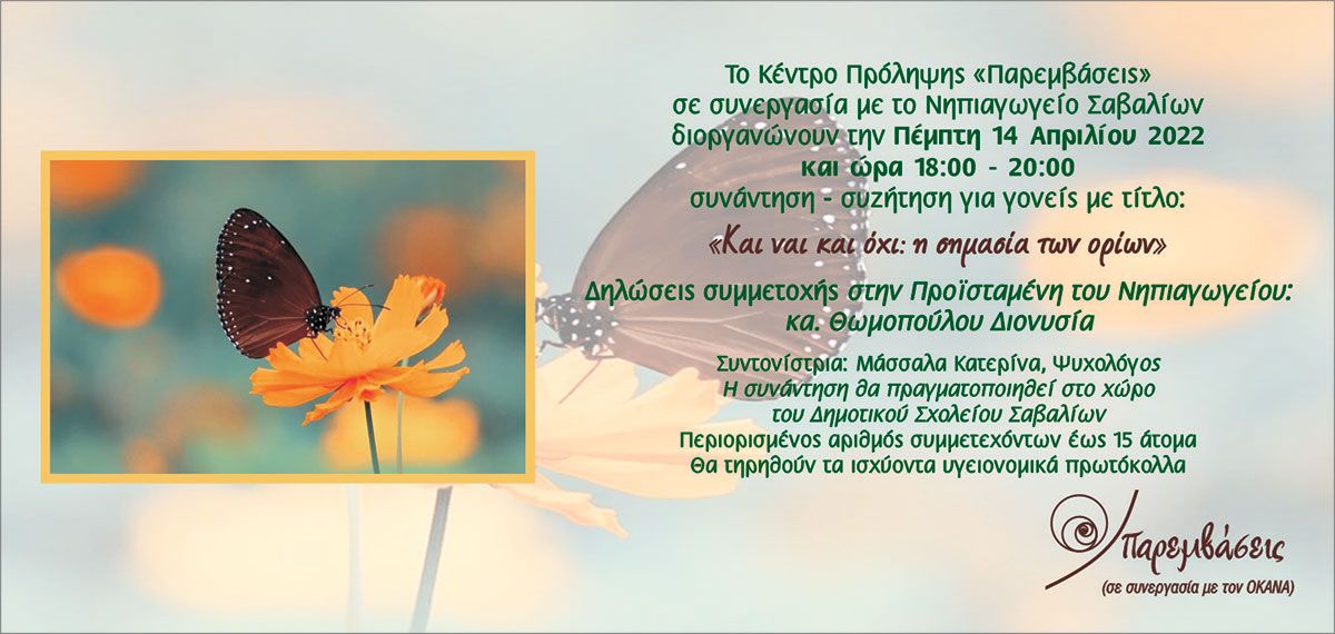 Το Κέντρο Πρόληψης «Παρεμβάσεις» σε συνεργασία με το Νηπιαγωγείο Σαβαλίων, στο πλαίσιο δράσης της σχολικής μονάδας για την ενίσχυση σχέσεων σχολείου και οικογένειας, διοργανώνουν την Πέμπτη 14 Απριλίου 2022 και ώρα 18:00- 20:00 συνάντηση- συζήτηση για γονείς με τίτλο: