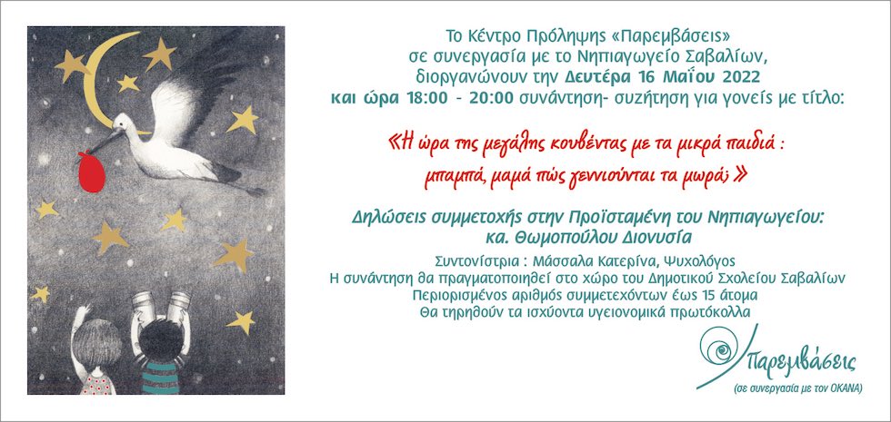 Το Κέντρο Πρόληψης «Παρεμβάσεις» σε συνεργασία με το Νηπιαγωγείο Σαβαλίων, στο πλαίσιο υλοποίησης δράσεων της σχολικής μονάδας για την ενίσχυση σχέσεων σχολείου και οικογένειας, διοργανώνουν την Δευτέρα 16 Μαΐου 2022 και ώρα 18:00- 20:00 συνάντηση- συζήτηση για γονείς με τίτλο: