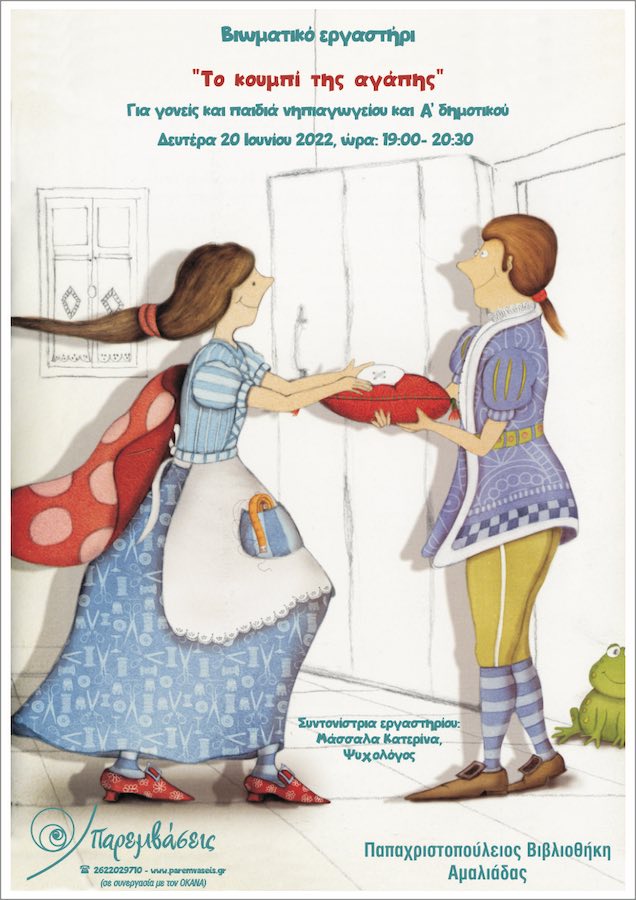 Το Κέντρο Πρόληψης «Παρεμβάσεις» σε συνεργασία με την Παπαχριστοπούλειο Βιβλιοθήκη Αμαλιάδας, με αφορμή την Παγκόσμια Ημέρα κατά των Εξαρτήσεων -26 Ιουνίου- σχεδιάζει να υλοποιήσει βιωματικό εργαστήρι , με τίτλο: « Το κουμπί της αγάπης» στον εξωτερικό χώρο της Παπαχριστοπουλείου Βιβλιοθήκης στην Αμαλιάδα, τη Δευτέρα 20 Ιουνίου 2022 και ώρα : 19:00-20:30.
