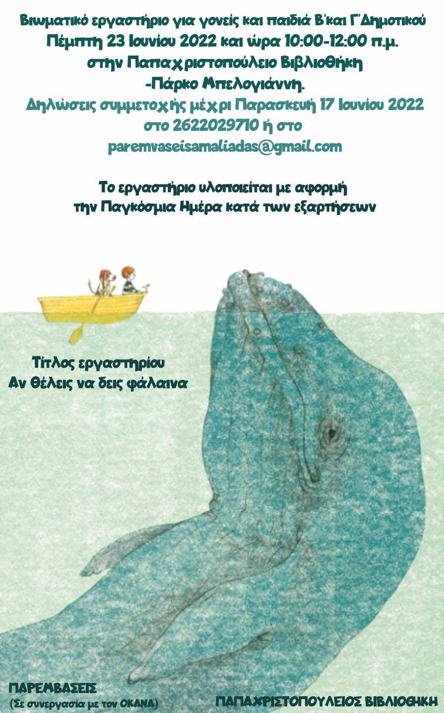 Το Κέντρο Πρόληψης των εξαρτήσεων και Προαγωγής της ψυχοκοινωνικής Υγείας σε συνεργασία με την Παπαχριστοπούλειο Βιβλιοθήκη Αμαλιάδας με αφορμή την Παγκόσμια Ημέρα κατά των Εξαρτήσεων, πρόκειται να υλοποιήσει την Πέμπτη 23 Ιουνίου 2022 και ώρα 10:00-12:00 π.μ. βιωματικό εργαστήρι για γονείς και παιδιά που φοιτούν στην ΄Β και ΄Γ δημοτικού με τίτλο «Αν θέλεις να δεις φάλαινα». Στόχος του εργαστηρίου είναι να δώσει σε γονείς και παιδιά τη δυνατότητα μέσα σε ένα χώρο ασφάλειας και αποδοχής να ανακαλύψουν νέους διασκεδαστικούς τρόπους για να πετυχαίνουν τους στόχους τους. Το εργαστήριο θα πραγματοποιηθεί στον εξωτερικό χώρο της Παπαχριστοπουλείου Βιβλιοθήκης, στο Πάρκο Μπελογιάννη. Συντονίστρια εργαστηρίου Σωτηρία Χαντζηκωνσταντίνου, ψυχολόγος. Λόγω περιορισμένου αριθμού θα τηρηθεί σειρά προτεραιότητας. Δηλώσεις συμμετοχής μέχρι την Παρασκευή 17/6/2022 στο 2622029710 ή στο