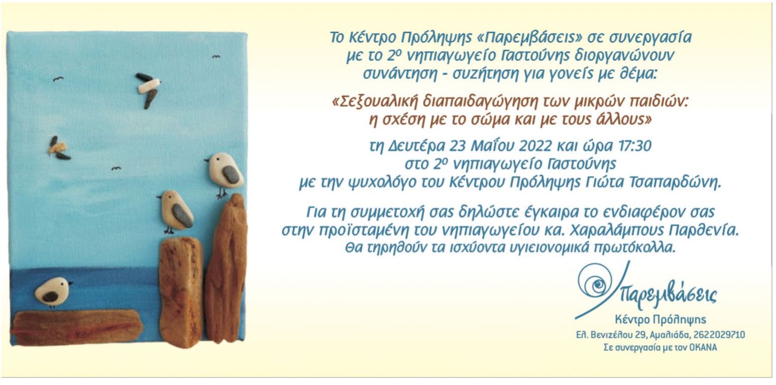 «Σεξουαλική διαπαιδαγώγηση των μικρών παιδιών: η σχέση με το σώμα και τους άλλους» ήταν το θέμα που συζητήθηκε με γονείς και εκπαιδευτικούς του 2ου νηπιαγωγείου Γαστούνης την Δευτέρα 23/5/2022 στα πλαίσια της συνεργασίας του σχολείου με το Κέντρο Πρόληψης «Παρεμβάσεις».