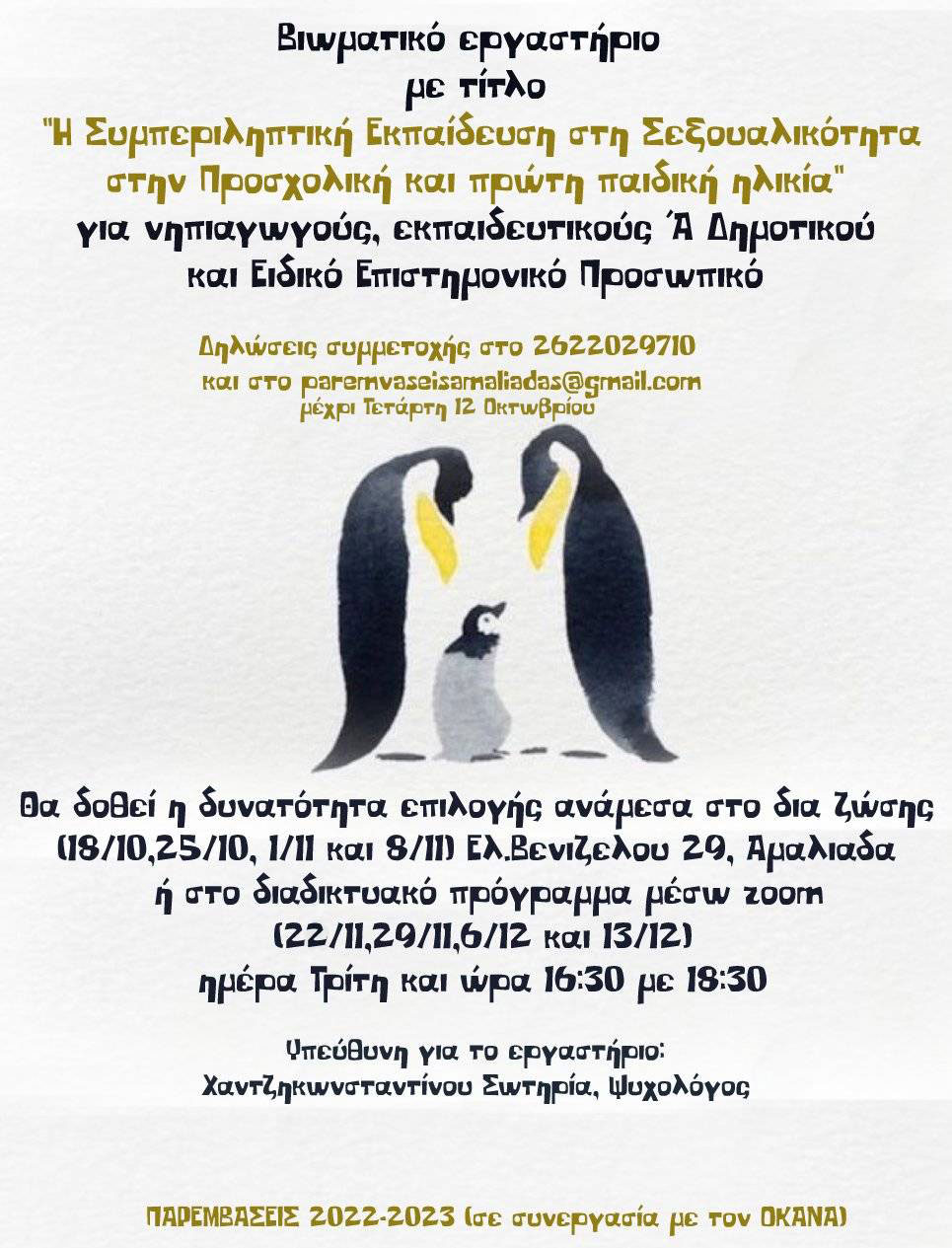 Ολοκληρώθηκε την Τρίτη 13 Δεκεμβρίου 2022 το εργαστήριο με τίτλο «η Συμπεριληπτική Εκπαίδευση στη Σεξουαλικότητα στην προσχολική και πρώτη παιδική ηλικία» για εκπαιδευτικούς προσχολικής Αγωγής, Α΄ Δημοτικού και ειδικό επιστημονικό προσωπικό με στόχο την εξοικείωση και εκπαίδευση στην έννοια της συμπεριληπτικής εκπαίδευσης στην σεξουαλικότητα και την αναγκαιότητά της στην προσχολική και πρώτη σχολική ηλικία.