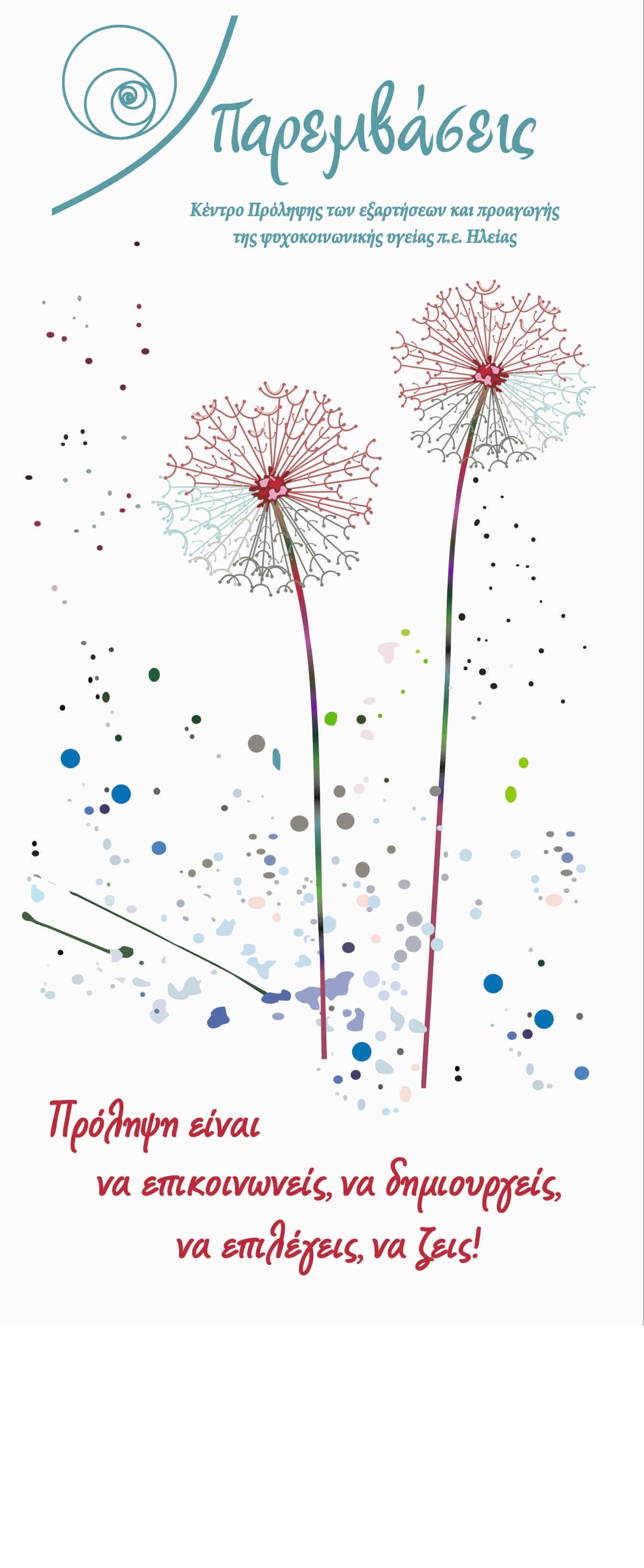 Στην Ελλάδα το έργο της Πρόληψης υλοποιείται από τα 75 Κέντρα Πρόληψης που λειτουργούν τις τελευταίες δεκαετίες και στην Περιφερειακή ενότητα Ηλείας από το Κέντρο Πρόληψης «Παρεμβάσεις» που λειτουργεί σε συνεργασία πλέον με τον νέο Εθνικό Οργανισμό Πρόληψης και Αντιμετώπισης των εξαρτήσεων Ε.Ο.Π.Α.Ε.
